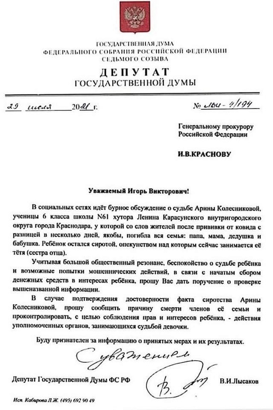 Вячеслав Лысаков потребовал расследования данной ситуации, так как считает, что это преступление со стороны медиков, которые неглядя отправили семью в полном её составе на вакцинация: