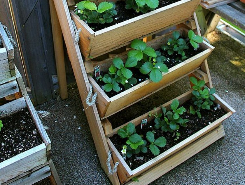 В случае с клубникой нам помогли лишь вертикальные грядки. Выглядят они примерно вот так.