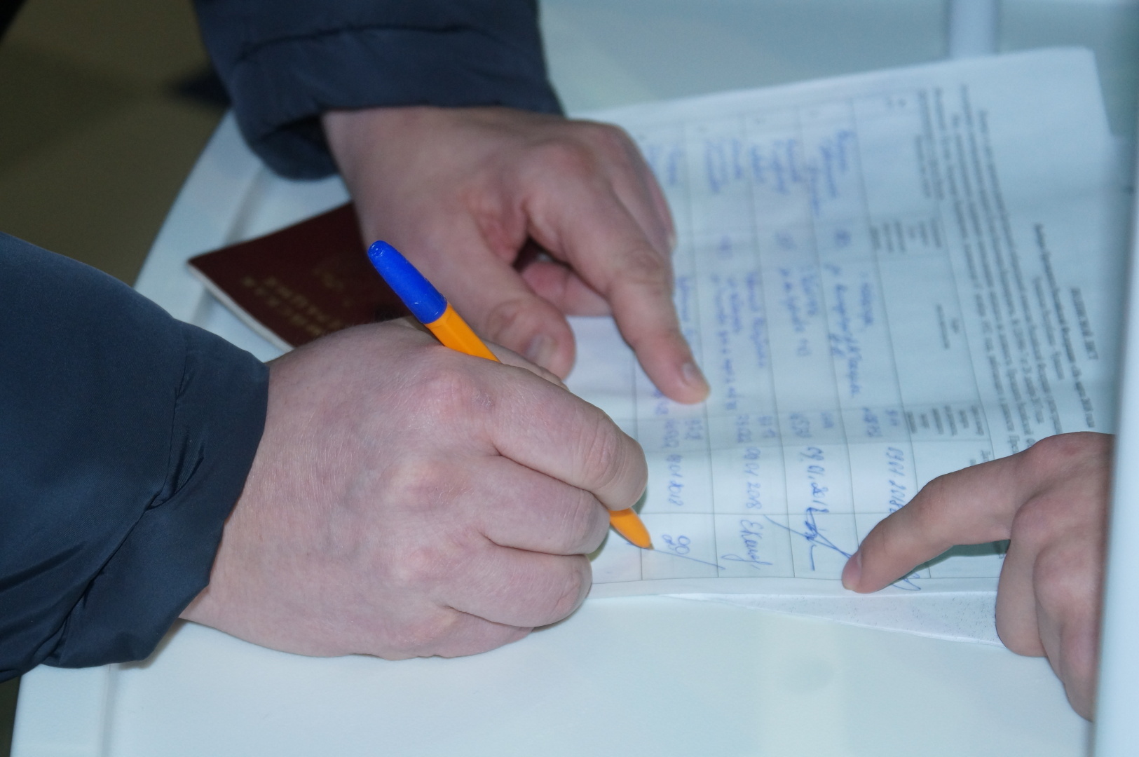 Избиратель приходит на избирательный участок и в Ведомости или в Журнале пронумерованном, прошнурованном и опечатанном печатью где указаны фамилии всех кандидатов, напротив нужной фамилии кандидата ИЗБИРАТЕЛЬ ставит свою подпись, а на против остальных кандидатов - прочерк.
