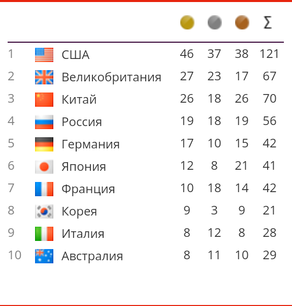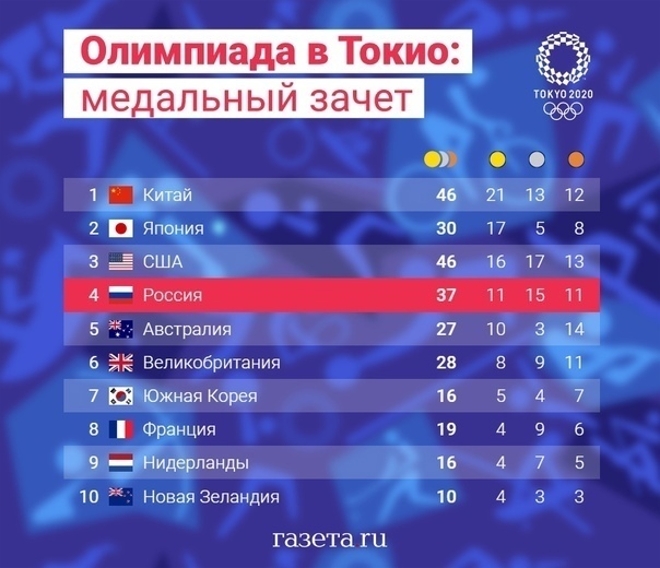 По состоянию на утро 1 августа первая пятёрка стран в медальном зачёте выглядела следующим образом: