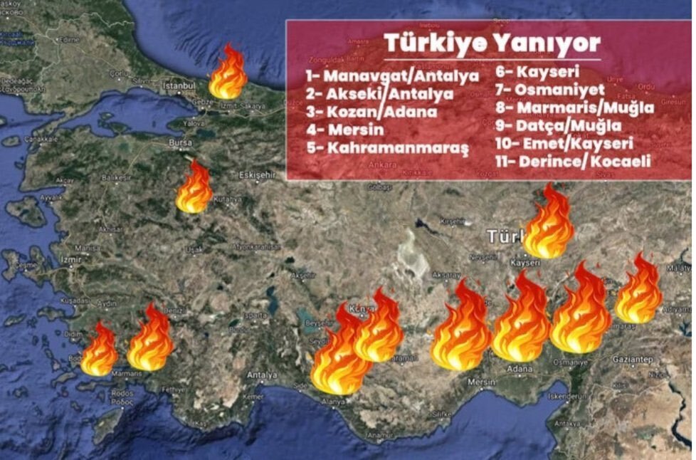 Власти Турции пока никак не прокомментировали это заявление. Накануне президент страны Реджеп Тайип Эрдоган сообщил, что задержан подозреваемый в поджогах. Он отметил, что задача властей - найти виновных в причинении ущерба Турции.