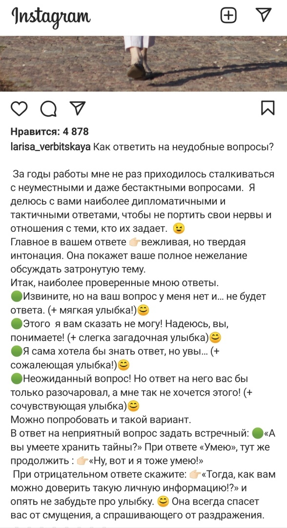 Лариса Вербицкая на своей странице в Инстаграмме https://www.instagram****.com/p/CSD2u68jRFp/?utm_medium=copy_link делится своим опытом как отвечать на неудобные вопросы:
