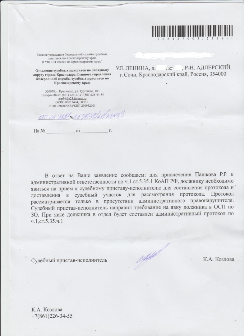 И вот свежий ответ на заявление о привлечении к административной ответственности по ст 5.35 КоАП РФ судебного пристава-исполнителя ОСП Западного окр г.Краснодара Козловой К.А.