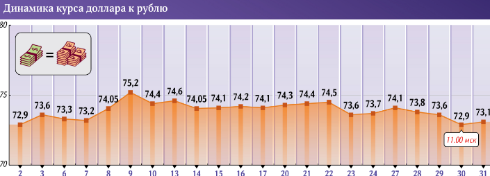 В пятницу, 30 июля, доллар опускался ниже 73 руб./$. Это минимальное значение с начала месяца. Впрочем, к концу торгов в тот же день курс валюты США вновь откатился до 73,1 руб./$.
