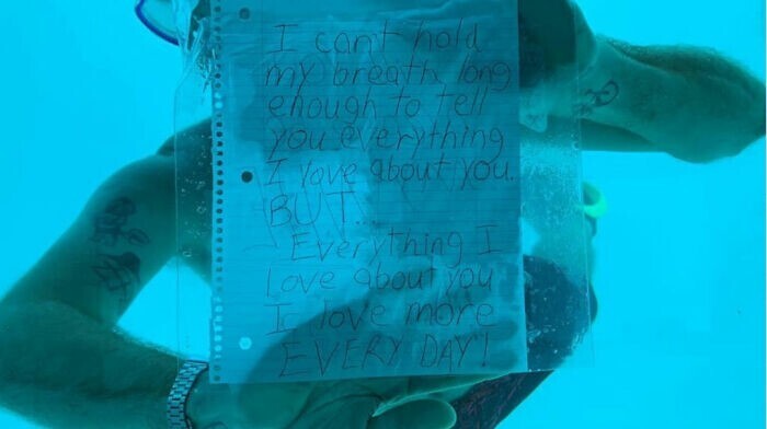 Молодой человек, так сильно любивший свою девушку, решил сделать ей предложение руки и сердца, но необычным способом. Он нырнул к своей девушке, которая находилась внутри их подводного номера в Танзании, и сделал ей предложение, показав записку и кольцо. Но, к сожалению, он умер до того, как успел доплыть до поверхности. Текст записки: