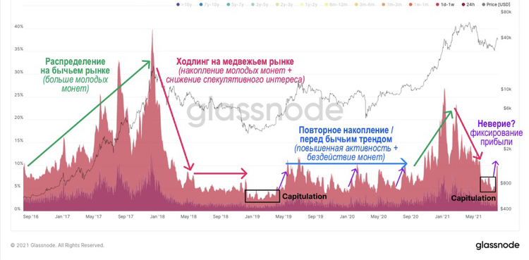 распределение бычьего рынка с конца 2020 по I квартал 2021 года, когда более старые монеты распределялись ускоряющимися темпами;