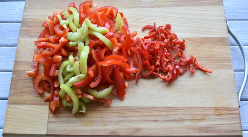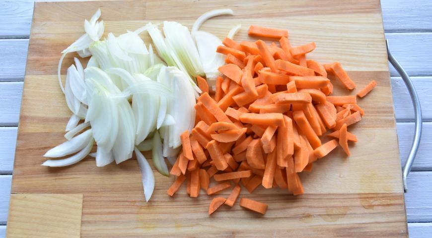 Подготовить овощи. Болгарский и острый перец освободить от семян и перегородок. Лук очистить от шелухи, почистить морковь.