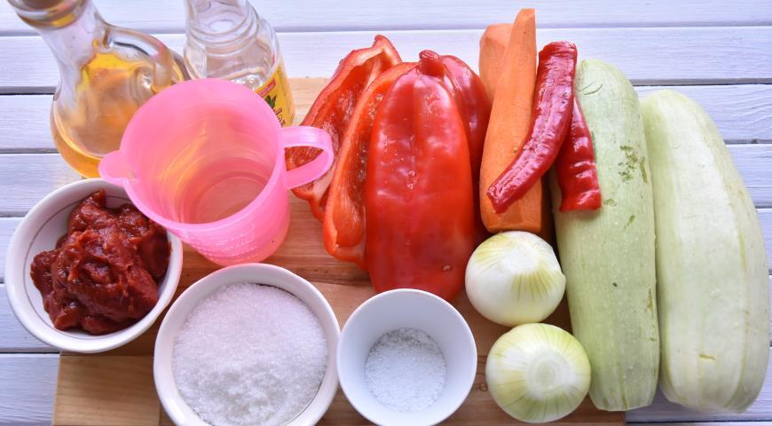 В казан с толстым дном влить растительное масло и выложить послойно все овощи: лук, морковь, болгарский и острый перец, кабачки.
