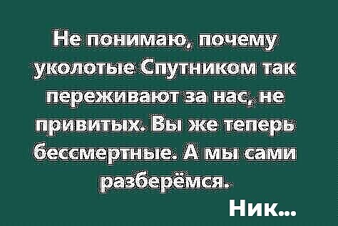 Я укололся и забылся!!!! Я оказался умнее многих, которые здесь мнят из себя стратегов!!! Я НЕ ЗАБОЛЕЮ!!! А ВСЕ ВЫ, ЗАБОЛЕЕТЕ, если не сделаете прививку от КОВИДА!!! Ковид никуда не ушёл. Он здесь. Он готовится к осенней вспышке пандемии. Готовьтесь и вы. Поверьте, я знаю, о чём пишу. За время этой пандемии много, очень много заболели из моих знакомых, и умер мой друг, одноклассник. Сестра с марта месяца до сих пор слабая, плохо себя чувствует. На работе, у дочки, приезжала целая бригада и вакцинировала весь коллектив. Но зам директора по финансам не захотела, была против. Теперь лежит в ковидном госпитале. За собой прихватила маму и сына. Всей семьёй лежат. Близок локоток, да не укусишь. Наверное, тысячу раз она ругала себя, что не сделала прививку. Моя дочь покупала ей лекарства и передавала в палату. ВСЁ ЕЩЁ ВПЕРЕДИ!!!! ВСЕ вакцины, во всём мире, пять лет не ждут. Их сразу колют. Посмотрите на статистику!!! В каких странах больше всего привитых? В инете статистика есть. Когда я её смотрел, то Канада была на первом месте. Привитых было 77%. А в России 24%. И смертность от ковида начала расти. Вирус мутирует в более злую форму. Вирус есть, но вы держитесь. Вирусов хватит на всех, вы не волнуйтесь. Каждому своё.