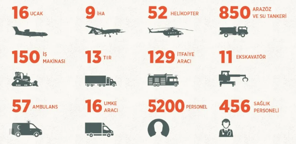 При тушении используется 16 самолетов, 9 беспилотников, 52 вертолета, 850 пожарных машин и цистерн с водой, 150 единиц строительной техники, 57 машин скорой помощи, более 5200 пожарных и 456 медицинских работников.