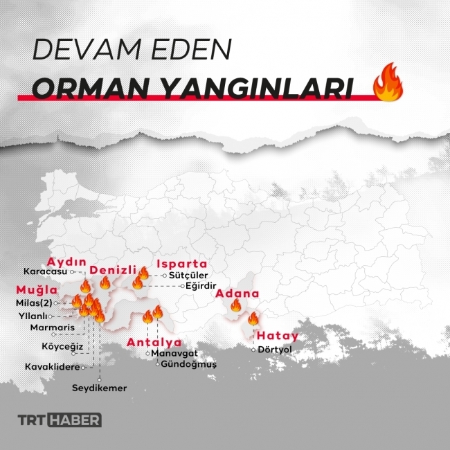 Пожар продолжает поражать Кисебюкю, Детскую гробницу Мази и Еникёй в Бодруме, а также плато и руины Феслеген в Миласе. Экипажи пытаются остановить распространение огня с помощью вертолетов и самолетов. Некоторые участки в Орене, до которых вчера доходило пламя, сгорели.