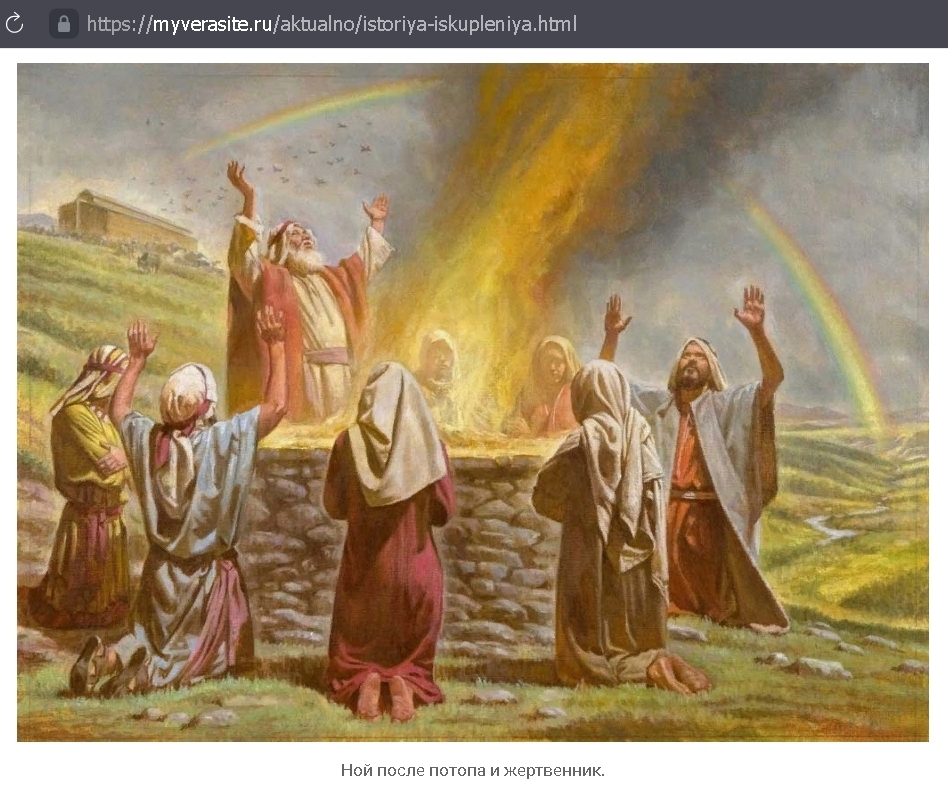 В Бытие 8:20 описывается процесс жертвоприношения строителя ковчега, пережившего с другими "пассажирами" всемирный потоп.