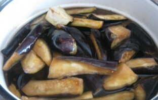 Через 2 часа тщательно промойте баклажаны. Переложите их в кастрюлю, залейте водой и доведите до кипения, после чего варите 5 минут.