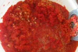 Пропускаем оба перца и зубчики чеснока через мясорубку.