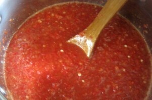 Полученную смесь перекладываем в кастрюлю. Добавляем масло, уксус, соль и сахар. Кипятим на среднем огне.