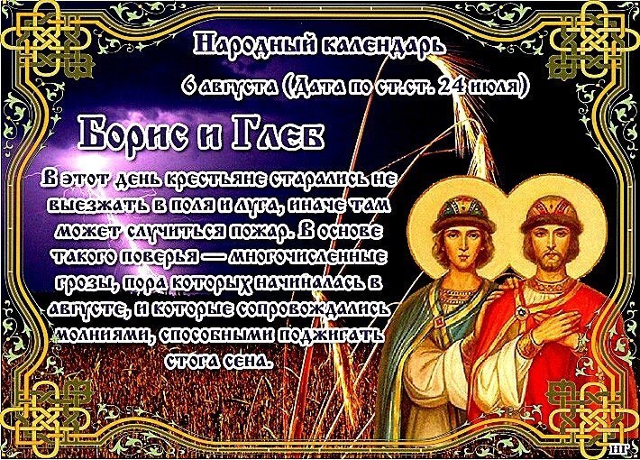 В этот день православная церковь чтит память первых русских святых Бориса и Глеба (в крещении Романа и Давида). Они были князьями, сыновьями великого князя Владимира Святославовича. Бориса и Глеба убил их единокровный брат Святополк Окаянный в борьбе за власть после смерти отца. По церковному преданию, на такой поступок Святополка толкнул дьявол.