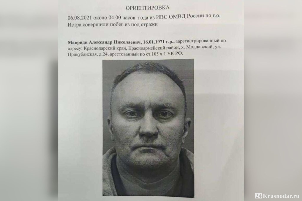 «Министерство внутренних дел Российской Федерации объявляет о назначении вознаграждения в сумме 1 млн рублей за помощь в розыске Мавриди Александра Николаевича, 16.01.1971 г. р., который обвиняется в совершении убийства, вымогательства, незаконного лишения свободы и в побеге из-под стражи», — говорится в сообщении полиции.