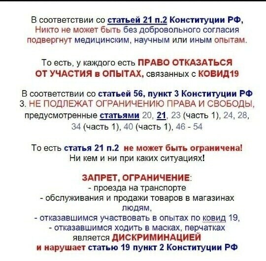 И последний важный момент: в интернете ещё пишут про некий загадочный судебный прецедент, мол, работодатель судился с Роспотребнадзором по поводу обязательной вакцинации и выиграл. И типа, давайте по примеру этого решения суда обжаловать вакцинацию по covid. Да только никто не читает это решение суда и не понимает, что оно не про covid, а про вакцинацию от гриппа и в принципе не применимо к нынешней ситуации с covid. И что интересно, те,кто пишут про этот суд акт, не упоминают специально про то,что он про прививки от гриппа. Это,кстати,-Постановление Девятого арбитражного апелляционного суда от 8 июля 2021 г. N 09 АП-31287/21 по делу N А 40-235016/2020.