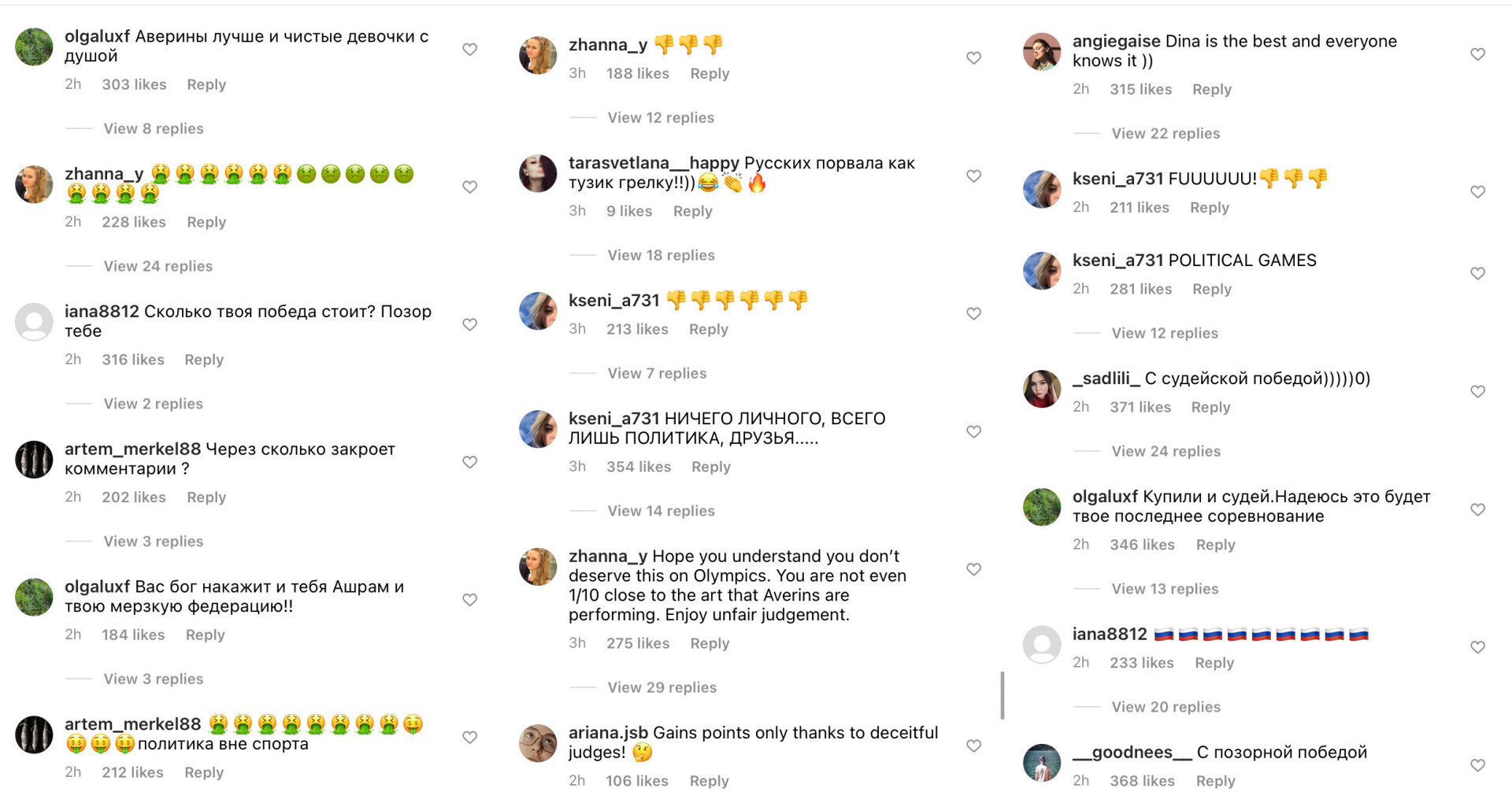 Главный тренер сборной России Ирина Винер-Усманова назвала судейство на Олимпиаде «позором художественной гимнастики»: «Дина Аверина сделала всё чисто, не ошиблась на последнем виде. Линой Ашрам, к сожалению, сделала вопиющую ошибку, за которую снимают очки все бригады и за исполнение, и за технику, и за артистику. Все должны были снимать». Она допустила возможность ухода из национальной команды, а также назвала происходящее в художественной гимнастике на играх в Токио диверсией.