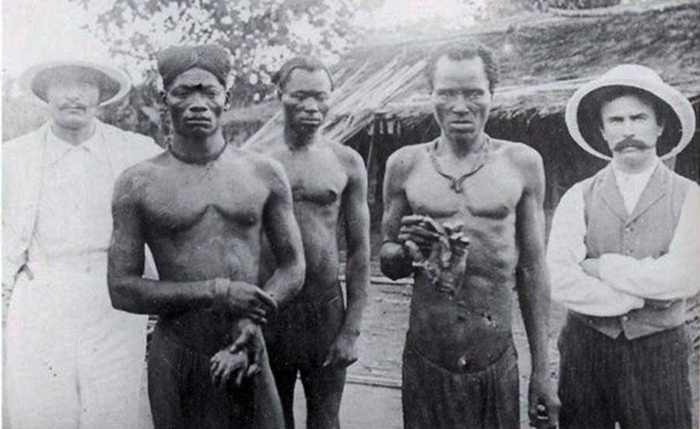 Присмотревшись, можно заметить, что перед этим задумчивым африканцем лежат отрубленные детские стопа и кисть. Фото сделано в 1904 году.