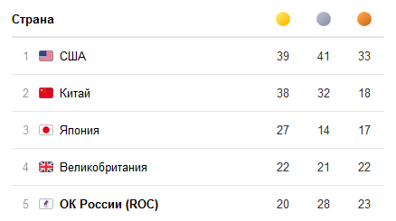 В Японии российские олимпийцы выиграли 20 золотых, 28 серебряных и 23 бронзовые награды. По общему числу медалей удалось превзойти результаты Игр в Лондоне и Рио-де-Жанейро, где было 68 и 56 наград соответственно. В общекомандном медальном зачете, который считается по золоту, сборная России заняла итоговое пятое место. По общему числу наград российские спортсмены находятся на третьей позиции. Больше сумели завоевать только американцы (113) и китайцы (88).
