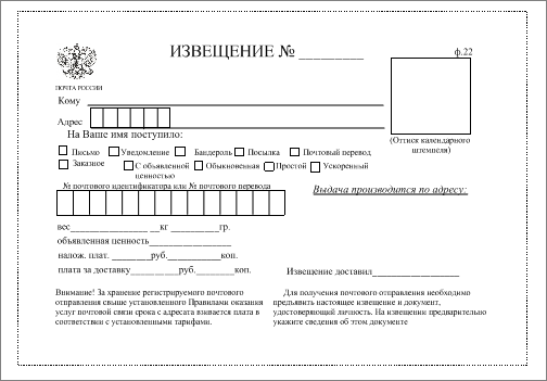 1. Извещение формы №22 следует подписывать только после того, как посылка взвешена и вы убедились в соответствии веса и целостности ее упаковки;