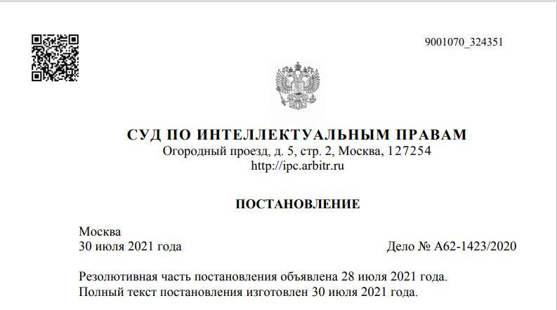Постановление Суда по интеллектуальным правам от 30.07.2021 N С 01-1188/2021 по делу N А 62-1423/202