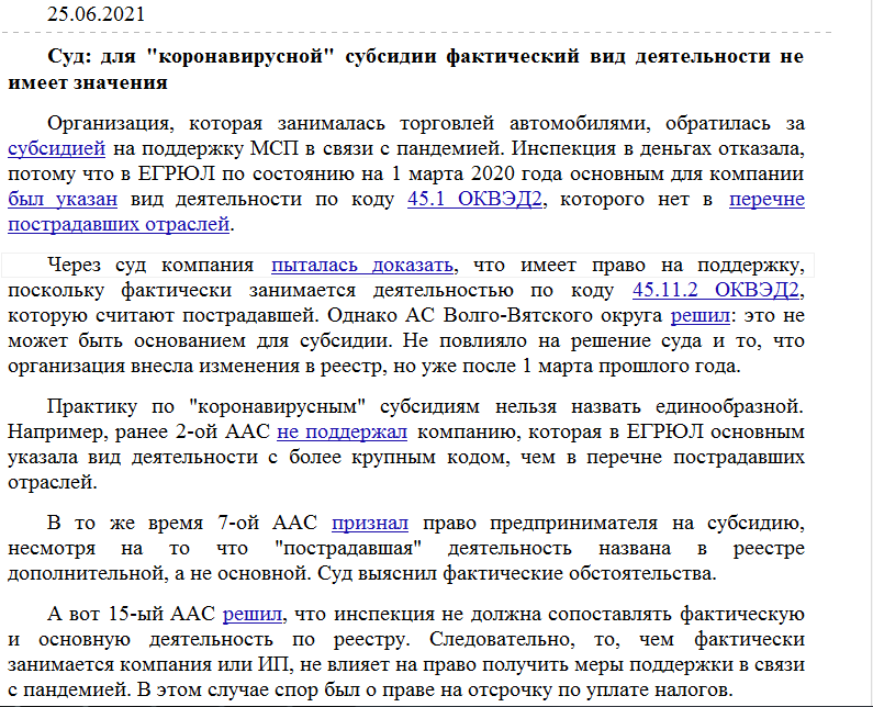 Суд: для "короновирусной" субсидии фактический вид деятельности не имеет значение.