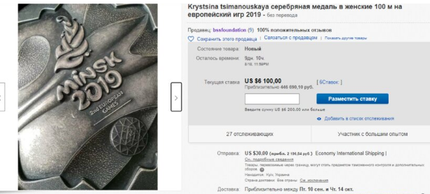 Кристина Тимановская, спортсменка из Беларуси, выставила на аукцион свою медаль. Начальная стоимость составляла 5 тысяч долларов.