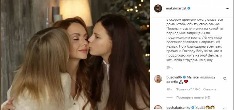 Артистка также отметила, что ее легкие пока восстанавливаются, их нельзя напрягать. Она выразила слова благодарности всем людям, медицинским специалистам и Господу Богу за то, что она продолжает жить и радоваться всему, что видит вокруг. В комментариях к публикации можно отыскать посты многих знаменитостей, которые пожелали Максим скорейшего выздоровления. На пост отреагировала певица Юлия Савичева, которая попросила звезду как можно скорее прийти в себя и начать процесс восстановления уже в домашних условиях. В комментариях отписались представители хоккейного клуба «Спартак» Москва. Также можно найти комментарий Софьи Таюрской из Little Big и Согдианы.