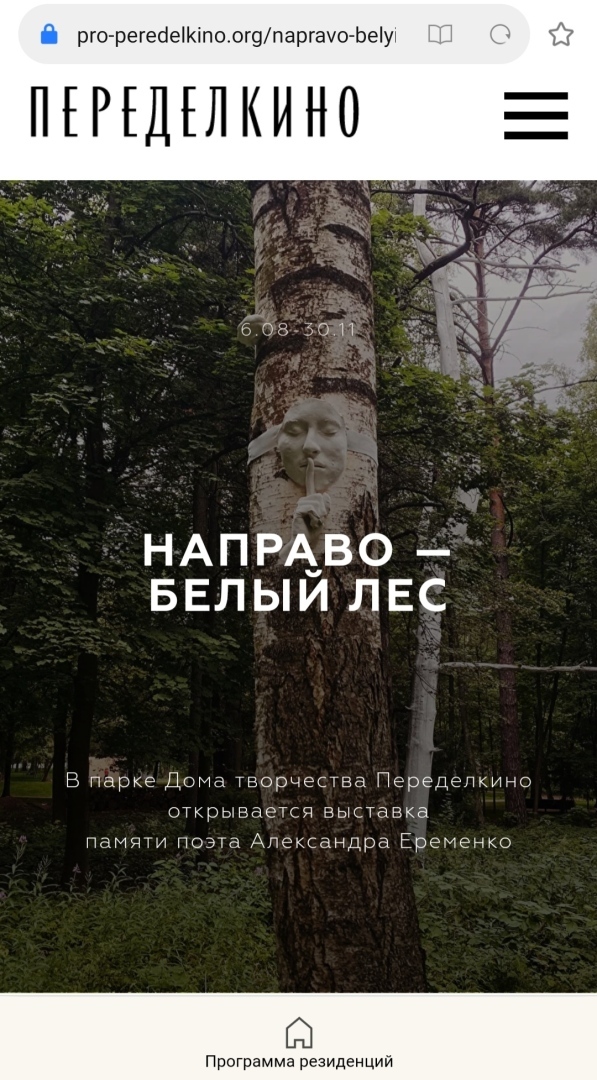 «Направо — белый лес» — мемориальное событие странного формата. Подобно экологичному погребению — в обход металлических оград и тряпочных цветов — выставка природных интеграций как способ памятования превратила поэтическое тело Александра Еременко в питательную среду для нового искусства. Предложив художникам создать объекты, вдохновленные стихотворением «Переделкино», мы получили визуально деликатные отклики на скрытые в нем смыслы. Эти работы похожи на ироничные строки поэта: воспринимая их вне контекста места и его истории, мы рискуем обмануться их простотой. Как кураторы мы благодарны Дому творчества Переделкино за возможность изучить потенциал метаметафоризма, поэтического метода Еременко, как стратегии развития альтернативных отношений между природой, художником и зрителем. Как и его текст о Переделкине, выставка памяти поэта стихийно распространила себя на другие измерения. Развиваясь в русле вольного творчества — неподконтрольного владельцу тела, не призванного говорить о покойном только хорошее — эта выставка превратилась в неформальный мемориальный эксперимент, который подверг переделке все компоненты стандартных памятных событий. В этом году каждый из нас думал о смерти, многие впервые говорили о ней публично, сталкиваясь с необходимостью подбирать адекватные происходящему слова.