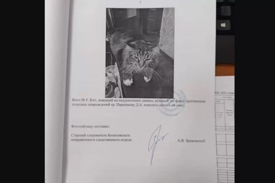 В материалах дела на одной из страниц размещена фотография кота. В подписи сказано, во время следственных мероприятий на диване лежал кот, который отказался давать пояснения правоохранителям, пишет «КП».