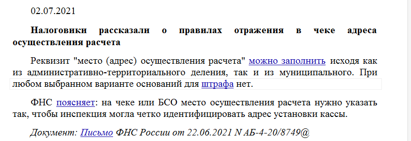Налоговики рассказали о правилах отражения в чеке адреса осуществления расчета
