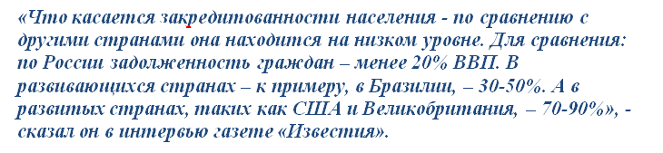 Однако после заявлений Центробанка о своих опасениях по поводу закредитованности граждан России Минэкономразвитие поспешило разуверить россиян, что ситуация с задолженностью в стране так плоха. По словам главы этого ведомства Ильи Торосова, с кредитами в России дела обстоят гораздо лучше, чем в других странах мира, так как долги россиян составляют всего лишь 20% ВВП.