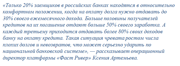 Кроме того, россияне зачастую берут кредиты для того, чтобы заменить ими снижающиеся доходы для обеспечения необходимого потребления. На мой взгляд, это очень опасный тренд, так как такая ситуация еще больше затрудняет дальнейшее погашение кредитов. Повышение кредитной нагрузки без увеличения заработков способно в конечном итоге стать опасным не только для заёмщиков, но и для банков, а так же для всей экономики в страны в целом.