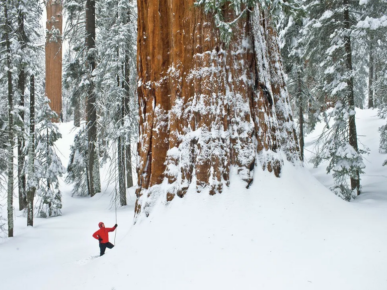 Гигантская секвойя любит снег и отлично переносит долгие зимы высоко в горах. Огонь ей тоже по душе: если вдруг ударит молния и начнется пожар, толстая кора не даст дереву сгореть, зато шишки на нем раскроются. Фото: Майкл Николс
