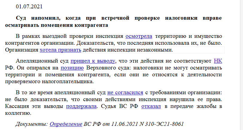 Суд напомнил, когда при встречной проверке налоговики вправе осматривать помещения контрагента.