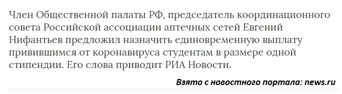 новой выплаты студентам, которые согласятся привиться от коронавируса.Примечателен тот факт, что данную идею выдвинул председатель координационного совета Российской ассоциации аптечных сетей Евгений Нифантьев, а не Глава Минфина или Минобрнауки. При этом уже известна сумма этой выплаты: она будет составлять в размере 1-ой стипендии за месяц.