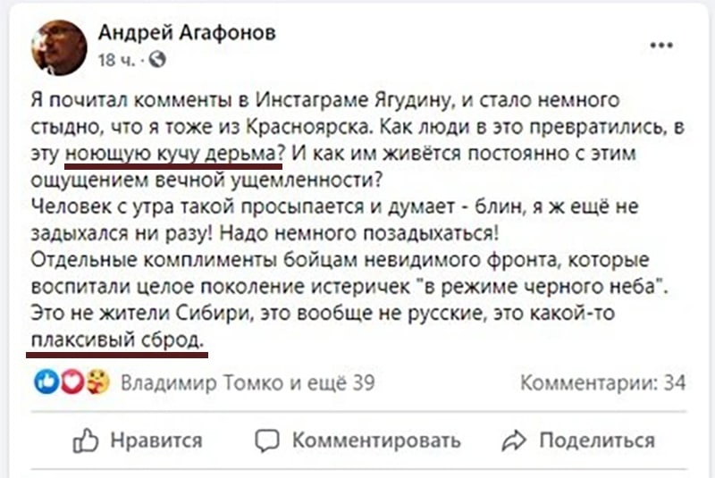 «Отдельные комплименты» Агафонов посвятил «бойцам невидимого фронта, которые воспитали целое поколение истеричек «в режиме черного неба»: «Это не жители Сибири, это вообще не русские, это какой-то плаксивый сброд».
