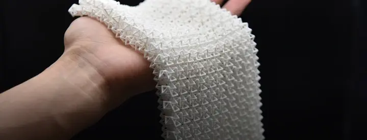 Легкая ткань напечатана на 3D-принтере из нейлоновых пластиковых полимеров. Она состоит из полых октаэдров (форма с восемью равными треугольными гранями), которые сцепляются друг с другом. В пластиковом конверте и в вакуумной упаковке ткань становится в 25 раз более жесткой и может выдерживать вес, превышающий вес в 50 раз больше своего.
