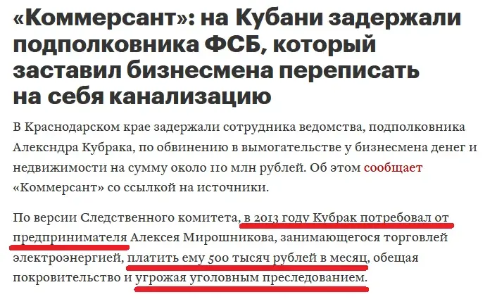 Фигурант истории подполковник Кубрак проходил службу в ФСБ Кубани с 2006 года. По данным следствия, по долгу службы он проводил оперативно-разыскные мероприятия в сфере энергетики.
