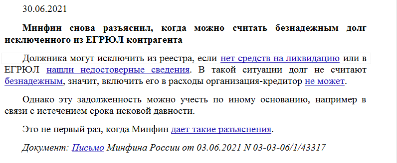 Минфин снова разъяснил, когда можно считать безнадежным долг исключенного из ЕГРЮЛ контрагента.
