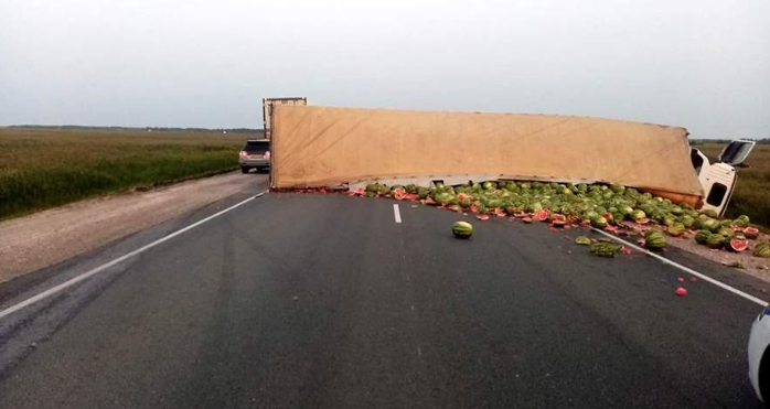 Читатель рассказал, что перевозивший арбузы грузовой автомобиль Volvo столкнулся с легковым автомобилем Lifan. В результате столкновения на встречной полосе пассажир легковушки скончался на месте, а его пассажирка была госпитализирована. Грузовик перевернулся и временно заблокировал проезд по автодороге.