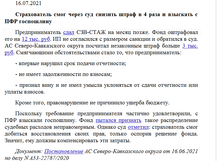 Страхователь смог через суд снизить штраф в 4 раза и взыскать с ПФР госпошлину.