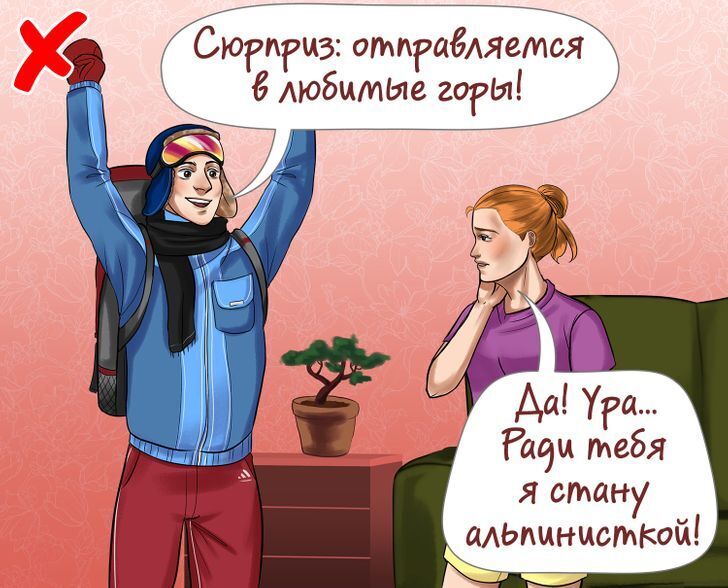 Некоторые люди, стремясь угодить своему возлюбленному, чрезмерно усердствуют, перекраивая не только свой характер, но и увлечения, привычки и даже внешность. Желание угодить партнеру — это хорошо, но только не тогда, когда оно посягает на личные границы. Так, например, если одному нравится путешествовать, а другой привык к спокойному и размеренному отдыху в домашней обстановке, то нужно будет искать компромиссы. Не стоит заставлять другого человека или самого себя делать то, что вам ненавистно, ведь в итоге это никого не сделает счастливым.