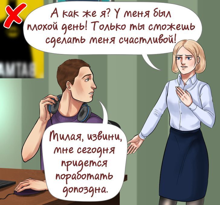 Нет ничего предосудительного в том, чтобы помогать своему партнеру и мотивировать его двигаться к новым высотам, будь то карьерная лестница или хобби. Тем не менее в стремлении сделать «как лучше» многие нередко перебарщивают. Если у вашего партнера имеются определенные ожидания на ваш счет, это совершенно нормально. Но только до тех пор, пока он продолжает любить вас и относиться к вам с пониманием даже в том случае, если вы не полностью им соответствуете. Нужно всегда помнить о том, что это ваше право в отношениях, а не рабочая обязанность.