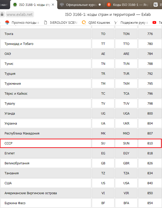 Но это еще не все! Википедия вещь хорошая, конечно, но не даром нас призывают ей доверять, но проверять. Дело в том, что в стандарте ISO 3166-1, выложенном в Википедии, кое чего нет, а именно - такого государства, как СССР. В принципе, оно и понятно: СССР распался, и это государство не должно фигурировать в этом списке. И действительно, СССР имеется в другом списке-