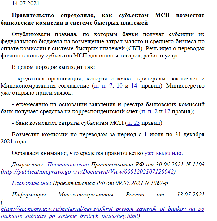 Правительство определило, как субъектам МСП возместят банковские комиссии в системе быстрых платежей.