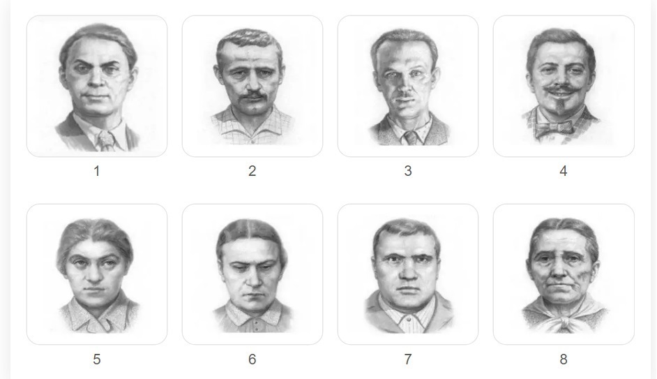 Посмотрите на портреты этих 8 людей и выберите того человека, которого бы вы ни за что не хотели встретить вечером в темном переулке, поскольку его внешность вызывает отвращение или пугает. Теперь можете узнать характеристики к выбранному портрету.