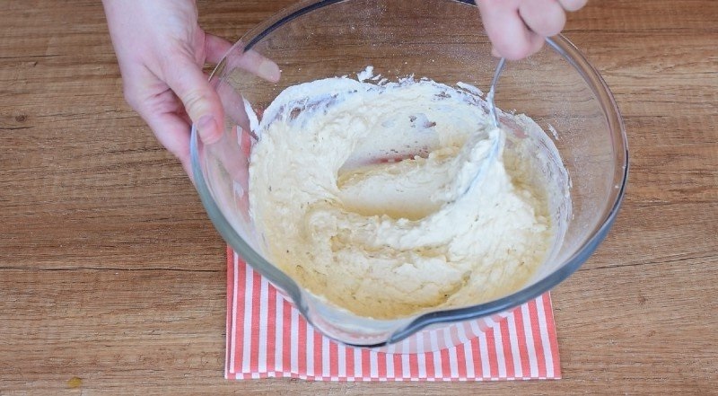 Яйца разбиваем в большую миску, немного взбиваем их венчиком, добавив соль. Затем, добавляем сметану, еще раз взбиваем, доливаем растительное масло. Просеиваем муку и разрыхлитель, вымешиваем тесто. Оно должно быть достаточно густым, похожим по консистенции на бисквитное тесто.